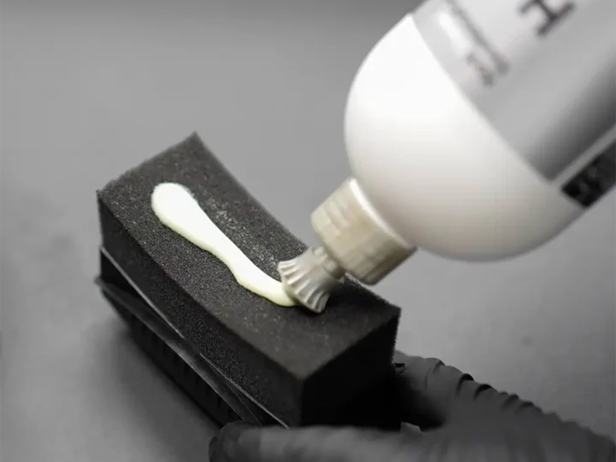 2. Alkalmazás: Vigyen fel egy kis mennyiségű Nanolex Trim Rejuvenator-t egy mikroszálas kendőre vagy applikátorra, és alaposan dolgozza be a terméket a felületbe, hogy egyenletes fedést biztosítson.