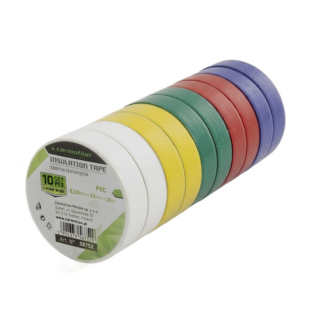 PVC szigetelőszalag 0,13 mm x 15 mm x 10 m, 5 színben, 10 db. PVC-ből készült, ragasztóval bevonva, amely biztosítja a pontos tapadást a védett elemek teljes felületén. A szalag ellenáll az időjárási viszonyoknak, az UV-sugárzásnak és a vegyszereknek, és ami a legfontosabb, nem gyúlékony.