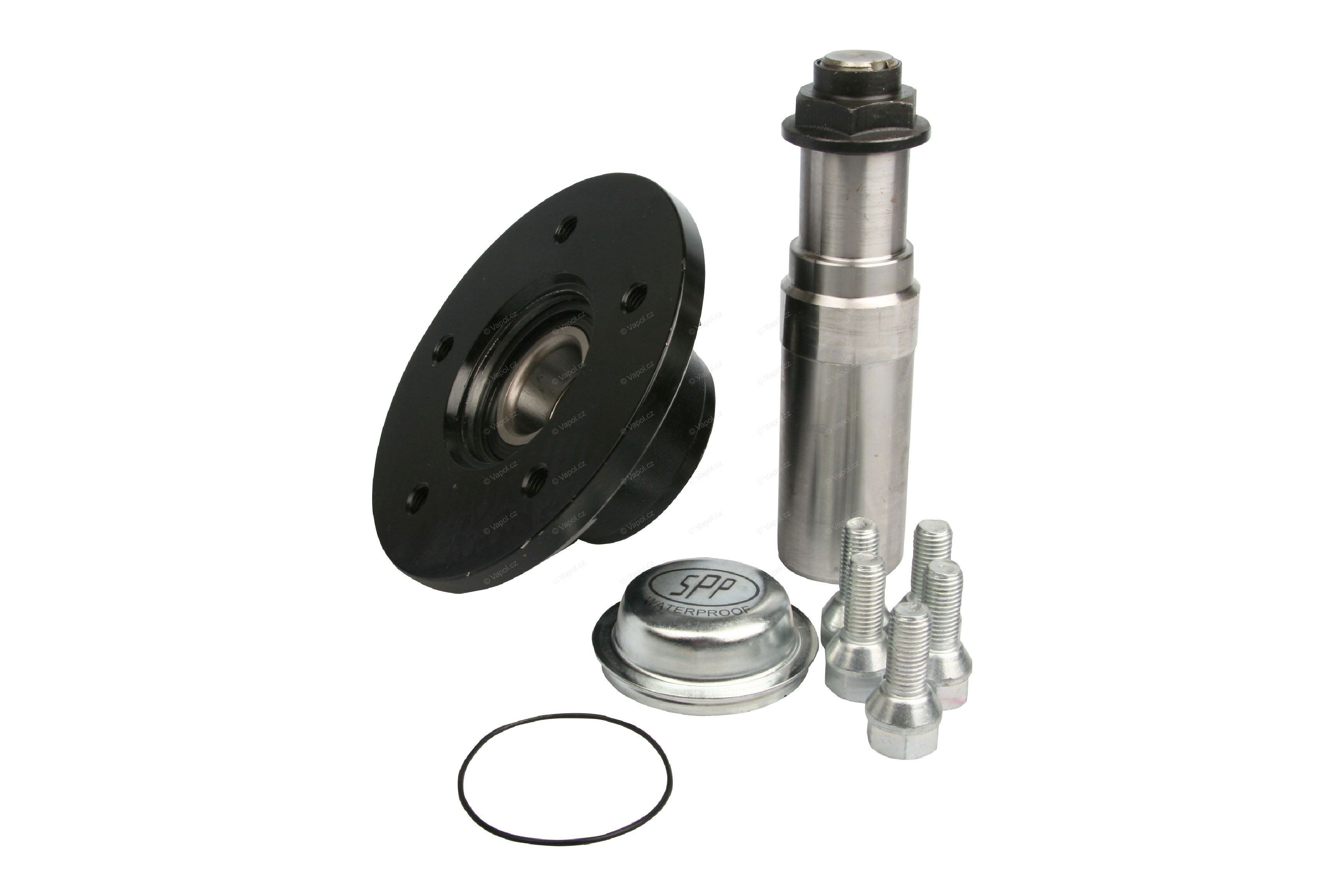 Komplett kerékagy csapágyakkal, csavarokkal és rögzítőcsappal, amely más típusú pótkocsikhoz adaptálható (pótalkatrész)