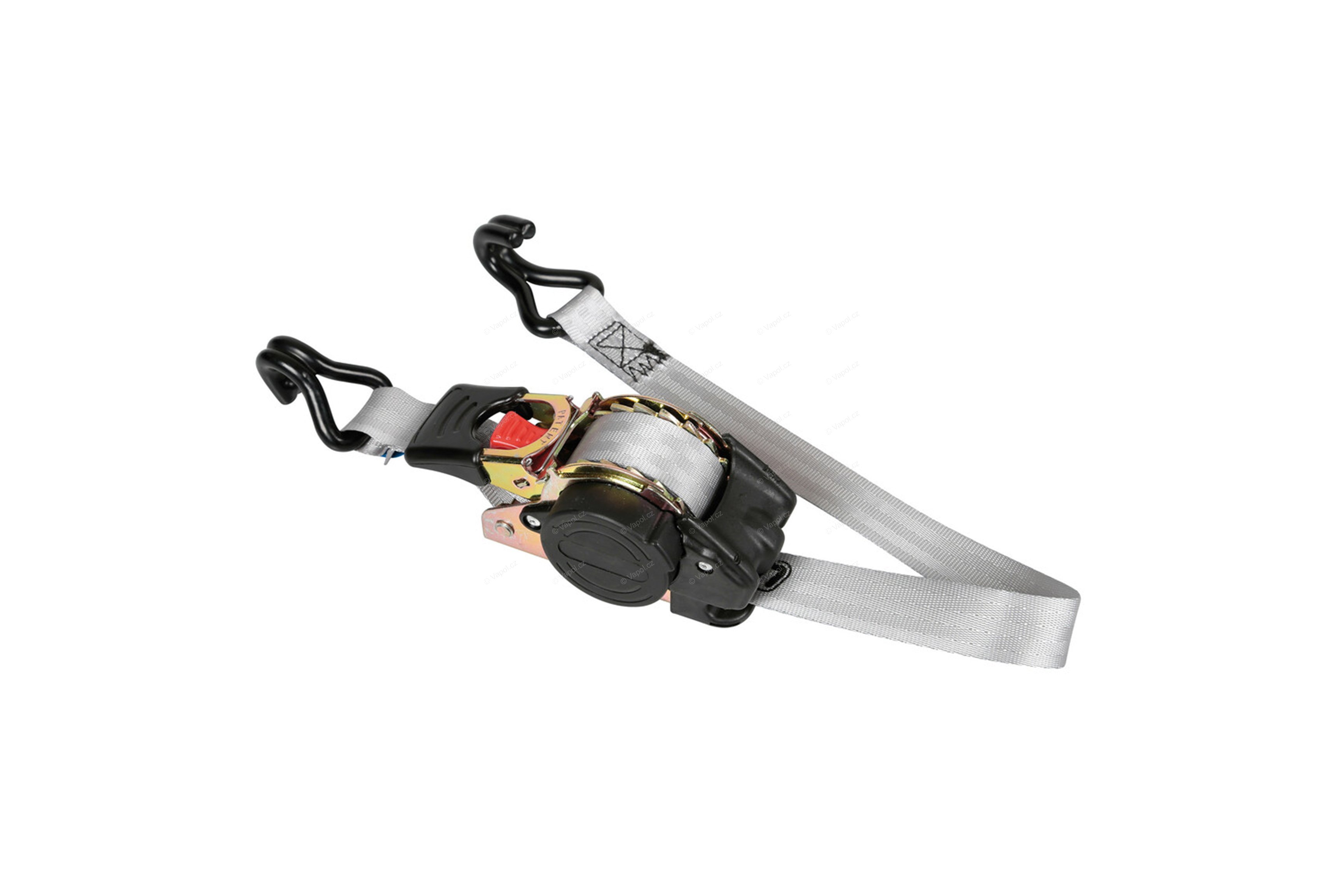 Öncsévélő heveder racsnival és dupla acél kampóval LC 750 daN Maximális rögzítés: 750 dan kötésben, 1500 daN húzásban Heveder szélessége: 50 mm Szín: szürke Heveder hossza: 3 m Az EN 12195-2 szabvány szerint készült Racsnis rögzítő heveder rakomány rögzítéséhez, kampókkal. A racsni fémből készült, automatikus zárszerkezettel, 50 mm széles, 3 m hosszú hevederrel. A szorítószalagot 750 kg-os szakítószilárdság jellemzi, 1500 kg-os terhelés mellett. Javasoljuk védőelemek használatát a rakomány rögzítésekor. Védőelemek használata nélkül a heveder megsérülhet. Ne használja a hevedert, ha az sérült! Tilos a rögzítőhevedereket teher emelésére használni. Összekötözött, csomózott és más módon nem megfelelően beállított hevdereket tilos használni. Használati útmutató: A hevder szabad és rögzített részének kampóját a jármű rakfelületén megfelelő helyen rögzítjük. Kihúzzuk a hevdert, miután kioldottuk a biztosítót a racsniból úgy, hogy a hevder teljesen át legyen húzva a rakományon. A kampókat a megfelelő helyeken akassza be. A racsnis karral meghúzzuk a hevedert. A hevedert úgy oldjuk ki, hogy a racsni reteszelését kioldjuk - a rugót összenyomjuk, és a racsnis kart 180 az ún. szabad helyzetbe elforgatjuk. Ezután a heveder szabadon kihúzható a racsniból. Figyelmeztetés: Csak annyira húzza meg a szorító racsnit, hogy ne sértse meg a rakományt. Csak a saját erejét használja a feszesítéshez. Soha ne használjon idegen tárgyat a racsni feszítéséhez. Tisztítás és karbantartás: A racsni mozgó fémrészeit szükség szerint megfelelő kenőanyaggal kezelje. Ha a heveder szennyezett, csak vízzel tisztítsa, ne használjon tisztítószert vagy vegyszert. A heveder megsérülhet.